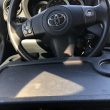 and the steering wheel doesn't have to be turned upside down. This makes the occasional eating in the car much neater. This table, I got the large one, is sturdy and does require a seat adjustment. The flip side has a nice writing surface and a place to secure a pen or pencil. Happy with my purchase. Suggest using this with the engine off if you intend to set your soda on the tray. The combination of power steering and the weight of a full drink on the tray can result in a wet lap. Lol, it hasn't happened yet but I'm just putting it out there