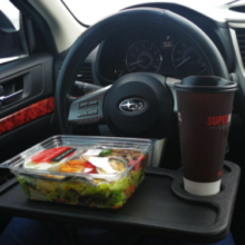 Since I am in university right now as a commuter, sometimes I spend a bit of time in my car as it is comfortable compared to uncomfortable desks/chairs at my campus. This table makes it easy to work inside the car for eating or working as it has two sides. 1 Side works as a lunch tray with a spot for a drink, other side is mainly flat for books or a computer.